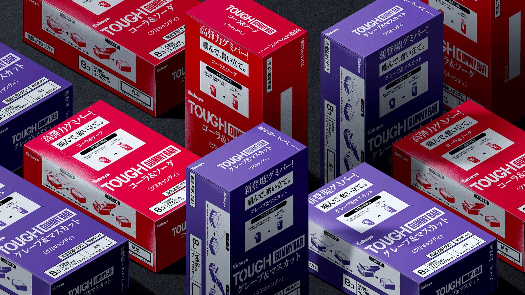 To inherit the Tough Gummy series’ signature addictive appeal—born from its uniquely high elasticity and the sharp刺激 of sour powder—while presenting an entirely new experiential value and establishing a distinct position within the market. Designed in a one-hand, easy-to-eat format, the product supports people who want to stay focused and keep going—whether during work, household tasks, studying, gaming, or any moment when they need to satisfy hunger without stopping. It needed to communicate its value intuitively and within one second at the point of sale. At the same time, the design required a careful balance: achieving clear differentiation from existing products while maintaining a coherent sense of connection to the overall brand.